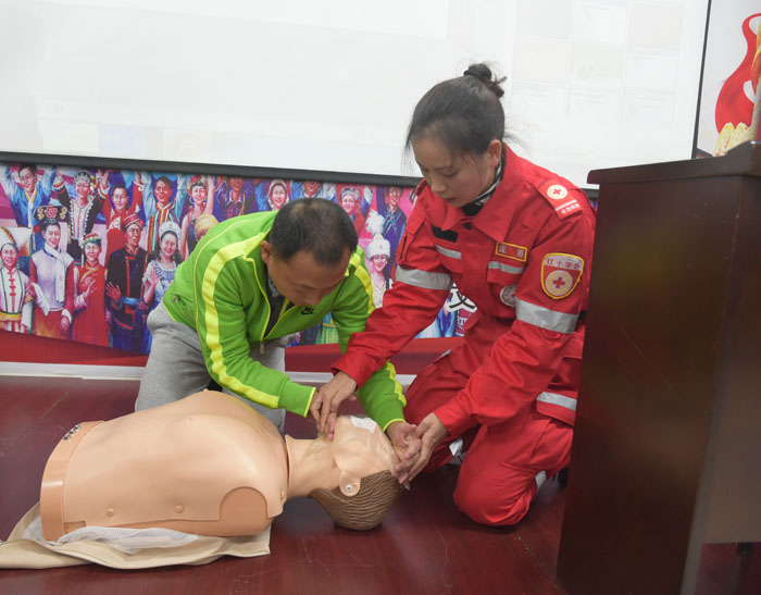 下午三点,自愿者应急救护学习培训在原州人大代表服务中心二楼道德讲堂举行,州红十字会的两位同志向机关干部职工讲解并示范如何对心脏骤停者、气道阻塞者进行施救,干部职工仔细听、认真看,积极参与示范学习。